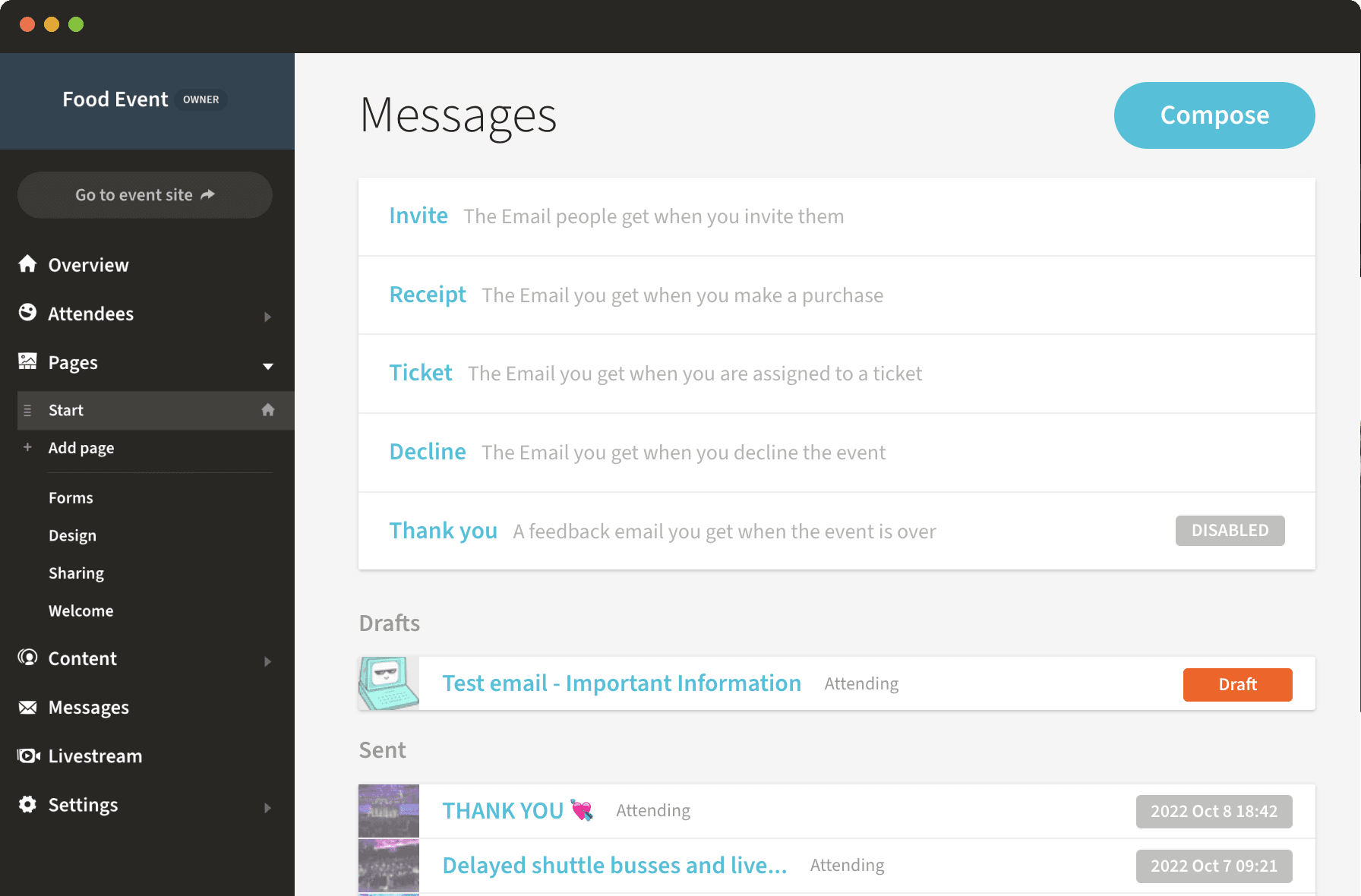 Each event page features a sequence of integrated email templates including copy (use them if you like). Ranging from the early 'save the date' to your post-event follow up. These emails naturally take on the look of your event page, guaranteeing guests a consistently stylish and on-brand experience.
